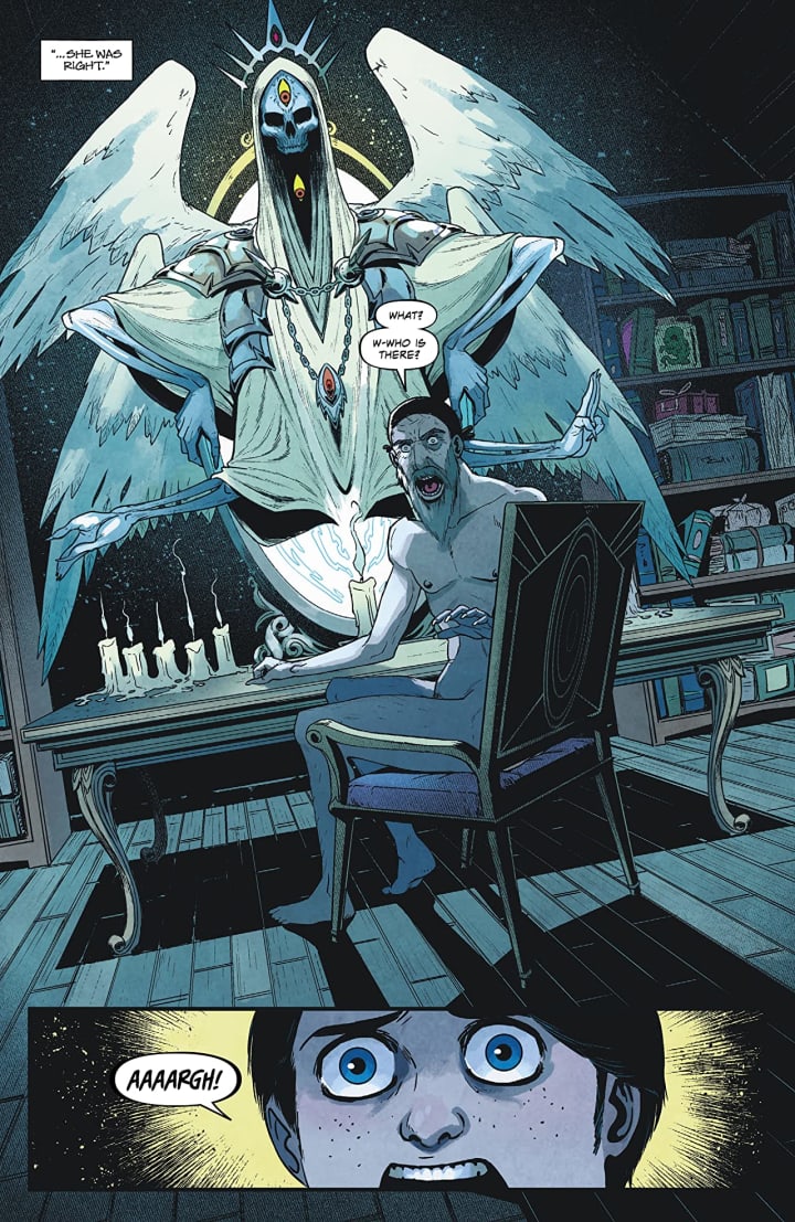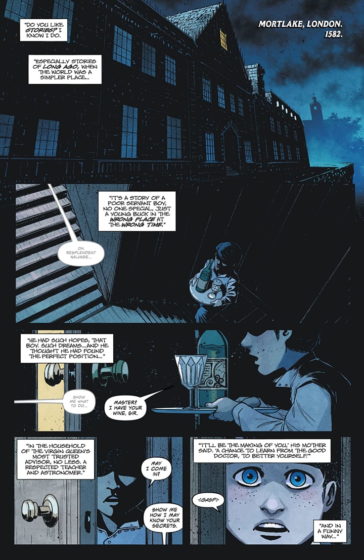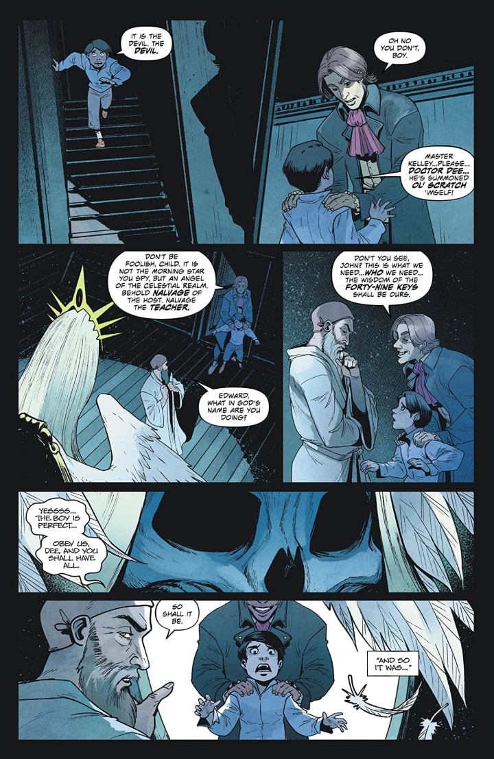 I am in love with this issue. Just the setting alone is amazing and gives you a whole new meaning to a dinner party from hell. Cavan is an amazing wordsmith and the way he’s able to craft a story and fill it with dialogue in such ways that excite the reader. How it is able to evoke such feelings and emotion throughout is utterly spectacular. The opening is phenomenal as what we see happen to this poor child is so thoroughly disconcerting and horrific, yet completely and utterly fascinating at the same time. While Doctor Dee may have wanted all the power for himself and himself alone fate has other plans and what better a conduit for such a creature than that of a child who is much more malleable and easily possessable than a fully formed grown adult man whose personality has already been formed.