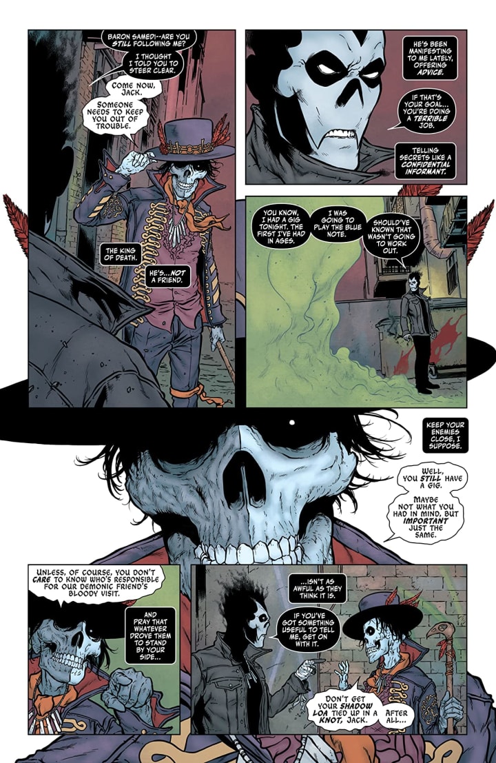 Well now this is interesting that’s for damn sure. First its been much too long since we’ve seen Jack and Shadowman and I couldn’t think of anyone better to tackle him than Cullen. The horror aspect of what he’s about and the deadside is going to be handled the way it should be and that excites me, even more so after having had the chance to read this. Plus the Loa of Death chasing Jack around is even better because while they aren’t friends the pairing does make for an interesting odd couple feel. There are so many different little moments that engage the reader making them think beyond what’s on the page as well as create a very different and unique angle to the depth and complexity of the storytelling. Jack thinks he works best alone but for now he’s got a shadow in Baron Samedi and this is where a lot of excitement comes from.