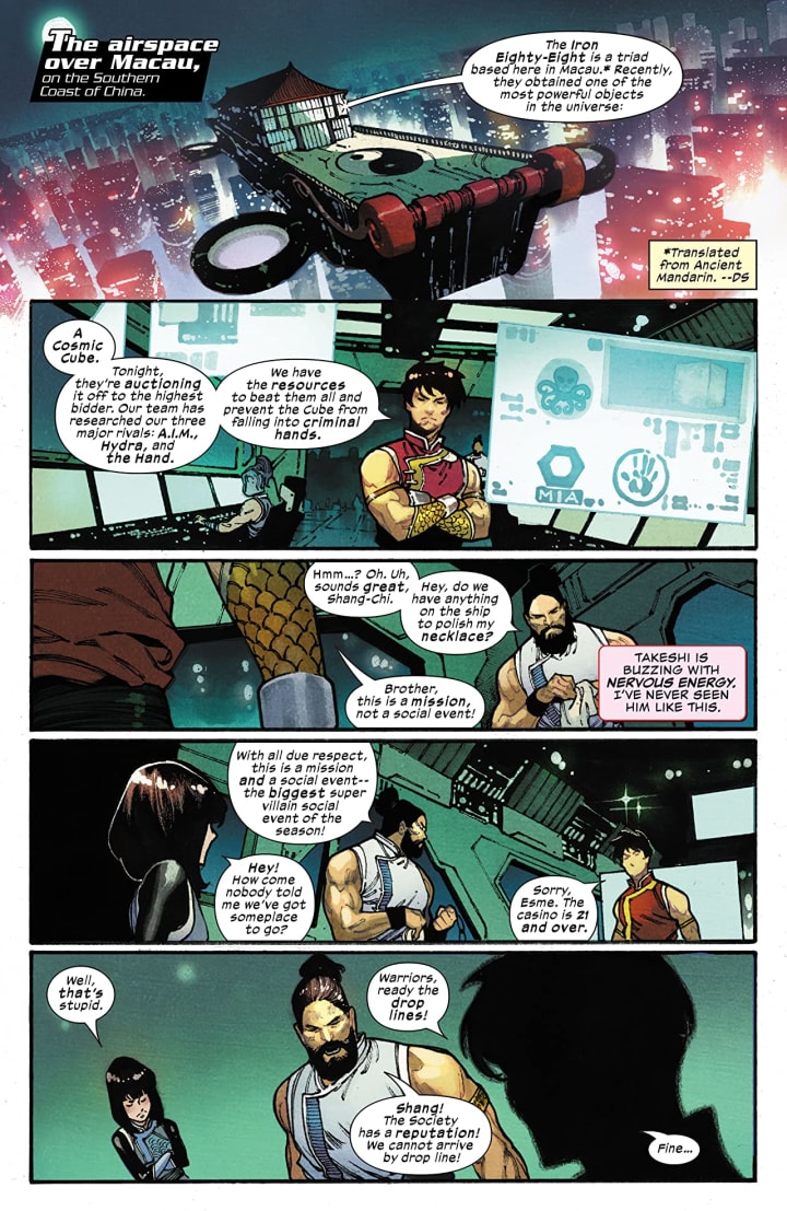 There’s a Cosmic Cube for sale, and everyone from Hydra to AIM to the Hand is ready to pay up for it. But Shang-Chi and his Five Weapons Society might outbid them! Unless a certain Star-Spangled Avenger has anything to say about it…Uh-oh…