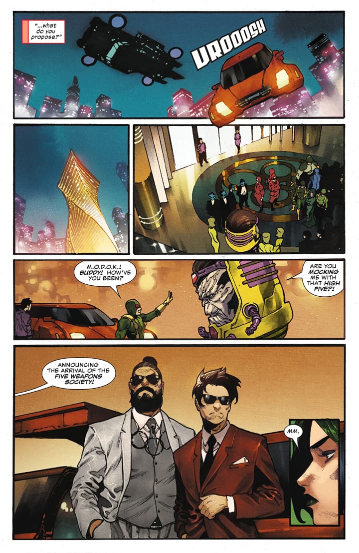 There are a couple of things that I wanna say right off the bat, I love the modified Shield Hellicarrier, I am not happy with the revelation and there is absolutely no way that Shang Chi is going to be able to take the Society and make it a force for good. That having been said lets talk about this issue shall we. I’ve always wondered how things like a Cosmic Cube finds it way into a villains auction? Something that powerful always seems to find itself in the hands of a villain and how many cubes are there anyway it because it does seem like they are a dime a dozen. This is how engaged the story has gotten me to be, that I am obsessed with the cube and pretty much everything that we see in the book.