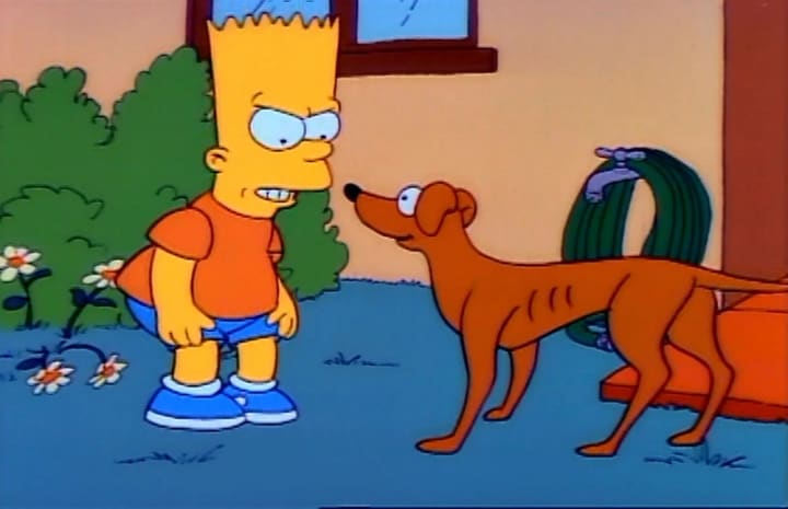 Lisa's being consoled by Marge, who later tells Bart that he could only come out if he apologizes to Lisa and truly means it. Bart emphatically passes, insisting that he's not in the wrong and runs off. He's joined by Santa's Little Helper, who's kicked out by Homer, and the pair head off to celebrate Thanksgiving in their own way. Doing so at Mr. Burns' mansion definitely doesn't work, and it's also followed by Bart actually donating blood--receiving $12 and a chocolate chip cookie for doing so. Seriously, Santa's Little Helper gobbling the cookie after Bart faints was just cute.