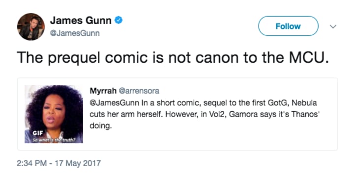 Cast your eyes back to the MCU, though, and it's easy to recognize the risk this creates. Attentive readers noticed that Guardians of the Galaxy Vol. 2 directly contradicted some of the ancillary material; a tie-in comic had given a very different backstory for Nebula and Gamora. Writer / director James Gunn gave a simple response; he declared that specific tie-in was not canon.