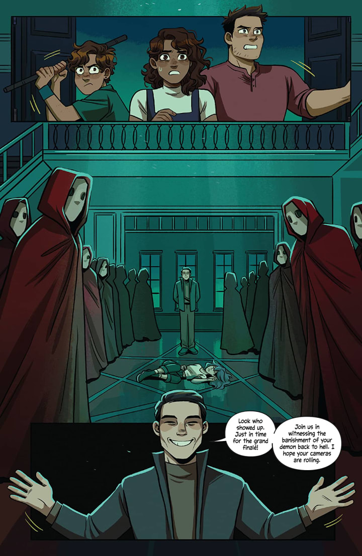 I am loving this series so very much. This may be the final issue of this arc and it is an oversized issue at that but that doesn’t mean it’s over, please don’t tell me i’m wrong because I want to see their further adventures. While this is a complete and phenomenal introductory story to these characters what surprised me the most about all this, other than that the kids who want instant fame by doing this program they hoped to get picked up, is how calm and cool under pressure they’ve been throughout all this. I mean they found a whole lot more than they bargained for and while they found ghosts it was because a demon found them first. So yeah in a completely roundabout manner they’ve succeeded beyond their wildest dreams.