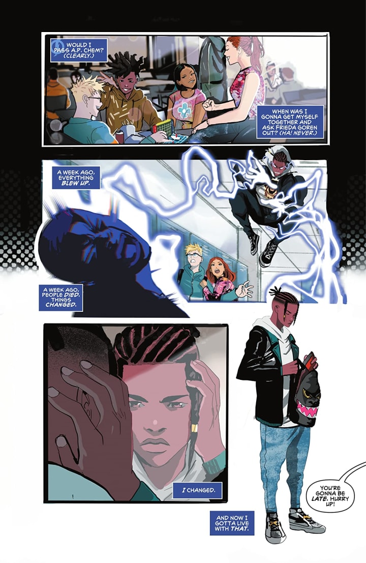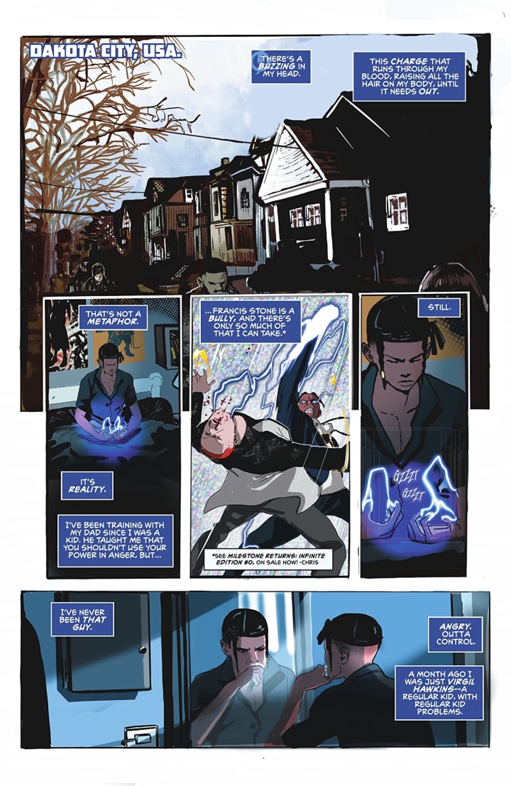 At long last, the most famous face of the Milestone Universe is making his shocking return! Bullied nerd Virgil Hawkins wasn't the kind of kid you'd normally find on the streets at a protest– but like everyone else in the city of Dakota, he was fed up. Unfortunately, the first time he stood up to raise his voice, the world turned upside down. The experimental tear gas released that day left some of his classmates maimed or dead…but it left Virgil, and others, with stunning new abilities. Virgil has power inside him now — real power, the ability to channel and manipulate electromagnetic fields. But there's anger burning inside him, too. What is he supposed to do about all of this? And first and foremost — what is he supposed to do about his bullies, now that they've got superpowers too?