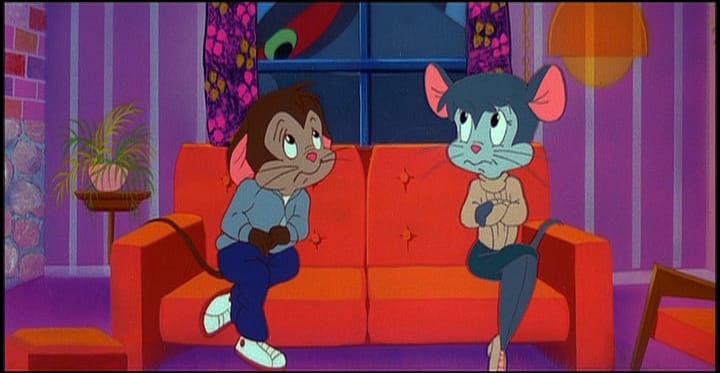 Like I said, this is a major mix of genres. It's part dark comedy, part action-adventure, and part spoof. Most of the jokes work for an audience with a warped sense of humor. I found Howard the Duck funny; so, I'm in that audience. I'm actually convinced the reason the movie bombed at the box office was because it was much darker than anyone would expect from a movie starring John Ritter. (Sure, he was in the It miniseries before then, but that's beside the point.) The action-adventure part is quite diverse and works very well. One minute Roy is dodging gunfire in a Maltese Falcon knock-off, the next he's swordfighting as Robin Hood against the Sheriff of Knottingham. Even the animated segment where Roy and Helen play mice pursued by a robotic cat (animated by the legendary Looney Tunes director Chuck Jones) got the thrills just right!