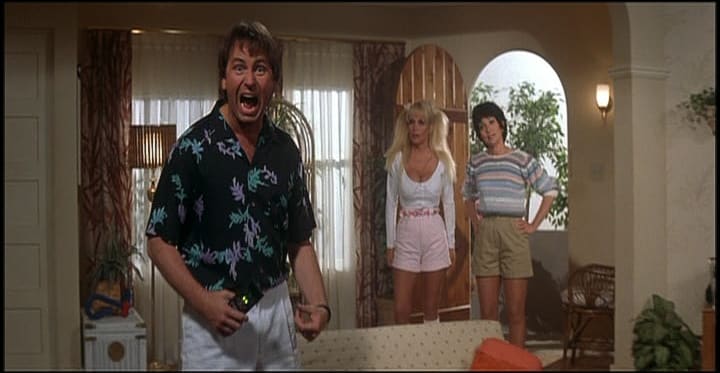 The film focuses on a couple named Roy and Helen Knable. They are played by two legends of classic TV, John Ritter from Three's Company and Pam Dawber from Mork & Mindy. (Yes, I know John Ritter was the star of 8 Simple Rules, too.) Their marriage is on the rocks. See, while Helen's career is on the rise, Roy is stuck in a dead-end job, leading him to escape into compulsive TV watching, shutting out the rest of the world. One night, Roy is visited by a salesman named Spike, played by Jeffrey Jones (whom I've mentioned multiple times in the past). He offers Roy a new high-end TV and free trial of a new satellite system. He accepts, and that's the last straw for Helen. While arguing, the couple are zapped, pulling them into a TV world. Thanks to a rejected executive named Crowley (Eugene Levy), Roy and Helen learn the truth. The TV shows are very lethal, and if they can't survive for 24 hours, Hell takes their souls.