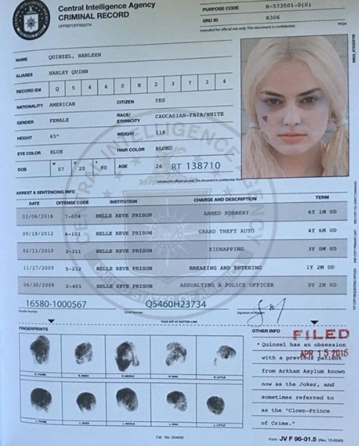Another inconsistent piece of information regarding Harley Quinn lies within her criminal file that was in the possession of Amanda Waller. This record, found in the companion book "Suicide Squad: Behind the Scenes with the Worst Heroes Ever," highlights her history -- including arrests, charges, and her obsession with the Joker.