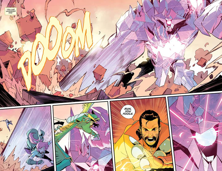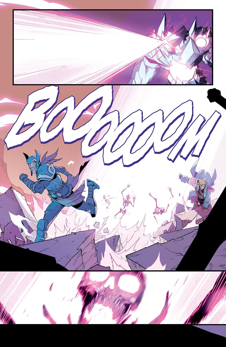 Love the interiors here. The linework is spectacular! How we see the varying weights and techniques being utilised to showcase this delightful detail work is stupendous. The creativity and imagination that we see is beautifully showcased and this mainly comes in the creatures that are summoned. I’m not going to suggest more backgrounds because of the setting this is in still because of the very nature of the book we get some perfect depth perception, sense of scale and the overall sense of size and scope to the story. The utilisation of the page layouts and how we see the angles and perspective in the panels show an extremely talented eye for storytelling. The colour work we see is astonishingly well rendered. If you look at the big bad and you see those various hues and tones within the colours being utilised to create the shading, highlights and shadow work is mindbogglingly good. This carries on throughout each character and the backgrounds and it really brings this to life in a spectacular fashion while demonstrating a brilliant eye for how colour works.