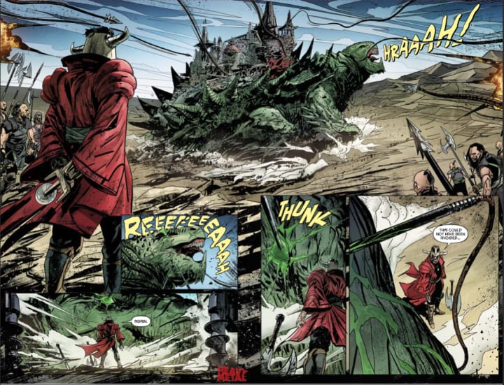 The interiors here are bloody gorgeous! The creativity and imagination is phenomenal to see and in the creatures, see snapping turtle and the snake, the landscape and Iridia’s Fortress all of these contribute to creating this familiar yet foreign world. The linework that we see is exquisite and with the varying weights and techniques being utilised we see this amazingly high level and quality to the detail work. I like the trick of the eye where there could be backgrounds but aren’t because we still get this great depth perception, sense of scale and the overall sense of size and scope to the story. The utilisation of the page layouts and how we see the angles and perspective show a remarkably talented eye for storytelling. The colour work that we see here is extremely nice to see. How the various hues and tones within the colours are being utilised to create the shading, highlights and shadow work show a great understanding of how colour works.