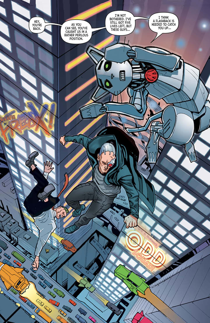 What I really like about the interiors here is that they really are a futuristic science fiction landscape. From a talking feline robot, Maurice, to the safety net to just the way we see the buildings and backgrounds throughout really makes a huge difference in how we see this. The linework is fantastic and how we see the varying weights being utilised to create the detail within the work that we see is well conceived and executed. The way that we see backgrounds enhance and expand the moments as well as how we see them work within the composition of the panels is marvellous to see. The utilisation of the page layouts and how we see the angles and perspective in the panels show a strong, talented eye for storytelling. The various hues and tones within the colours being utilised to create the shading highlights and shadow work show a great understanding of colour.