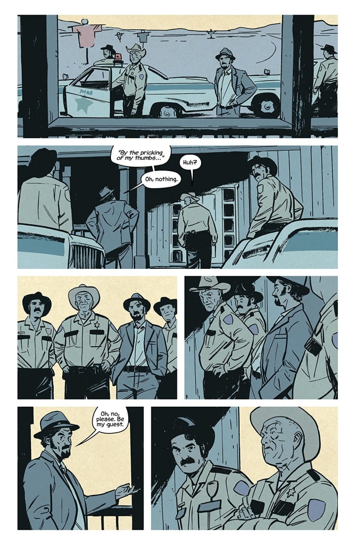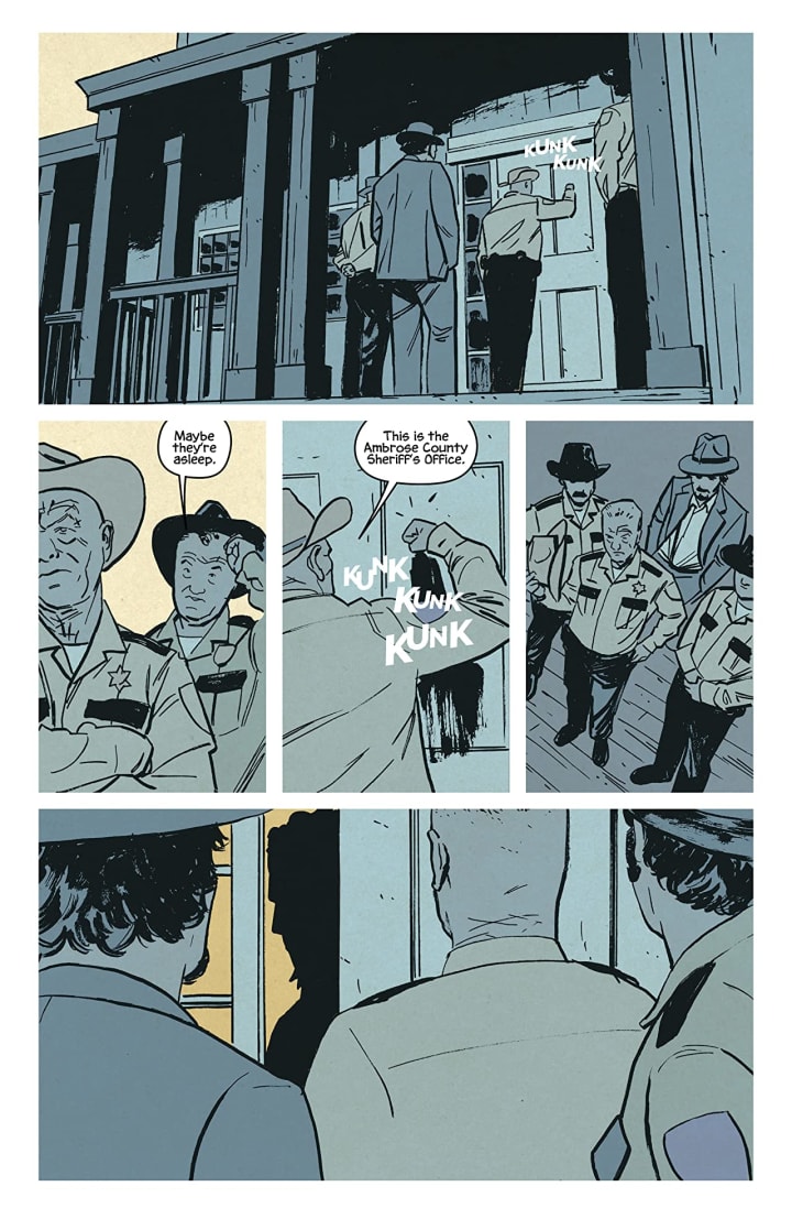 After the sensational first arc of this series we’re back in time to a previous case and one of the current sheriff’s first. This has all the excitement and tension that the first arc had and in a lot of ways it’s so much more tension and creepy. I say this because while we think we know what to expect we are far from being in the realm of correct in our thinking. This is a different case and has different folks and while it contains some massively grotesque imagery already there is still so much more to come. I like the addition of the private investigator to this story because of what he adds to the mix as not only an unknown quantity but as his status as an outsider to this community as well. There are aspects to this that are added which we aren’t expecting or haven’t seen yet that really manages to add to the whole creepiness factor.