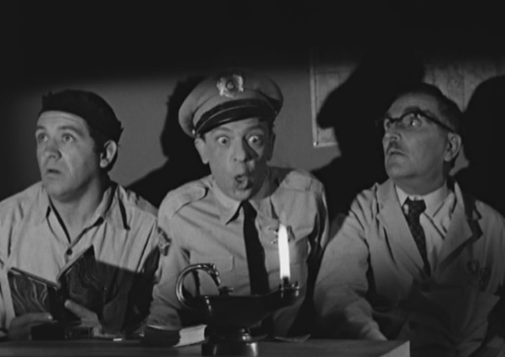 It began with Barney Fife (Don Knotts) purchasing a fortune-telling game at a police auction and spooking Goober Pyle (George Lindsey with supernatural tales. They are in a back room in the Sheriff's office, where Barney lit an old lamp that looked like the type a genie would emerge from.