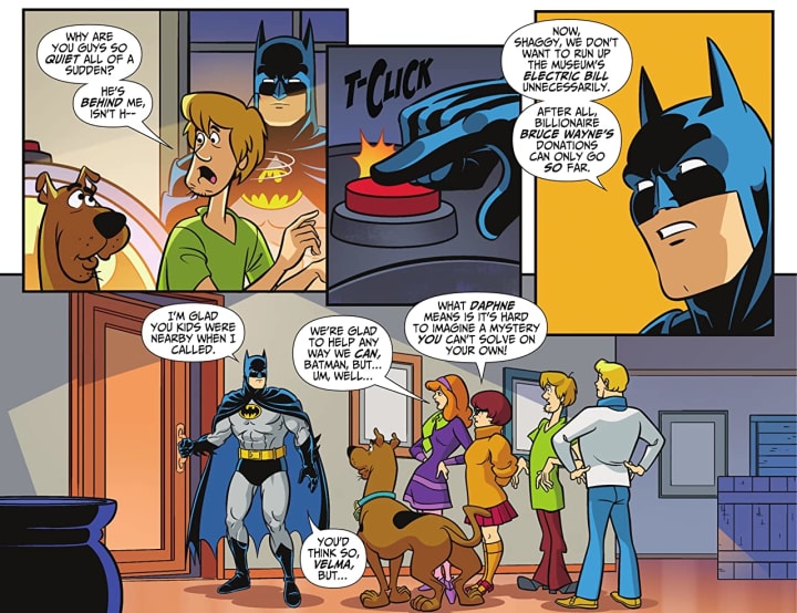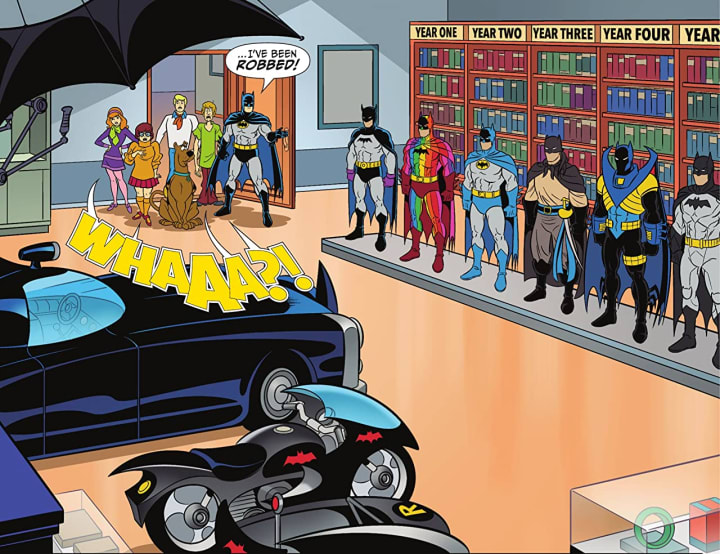 An all-new series teams the Dark Knight with Scooby-Doo and the sleuths of Mystery, Inc.! When Batman discovers his original purple gloves have gone missing, Velma, Shaggy, and Scooby-Doo travel back in time to Batman’s Year One to solve the case! Will this “Glove Story” have a happy ending?