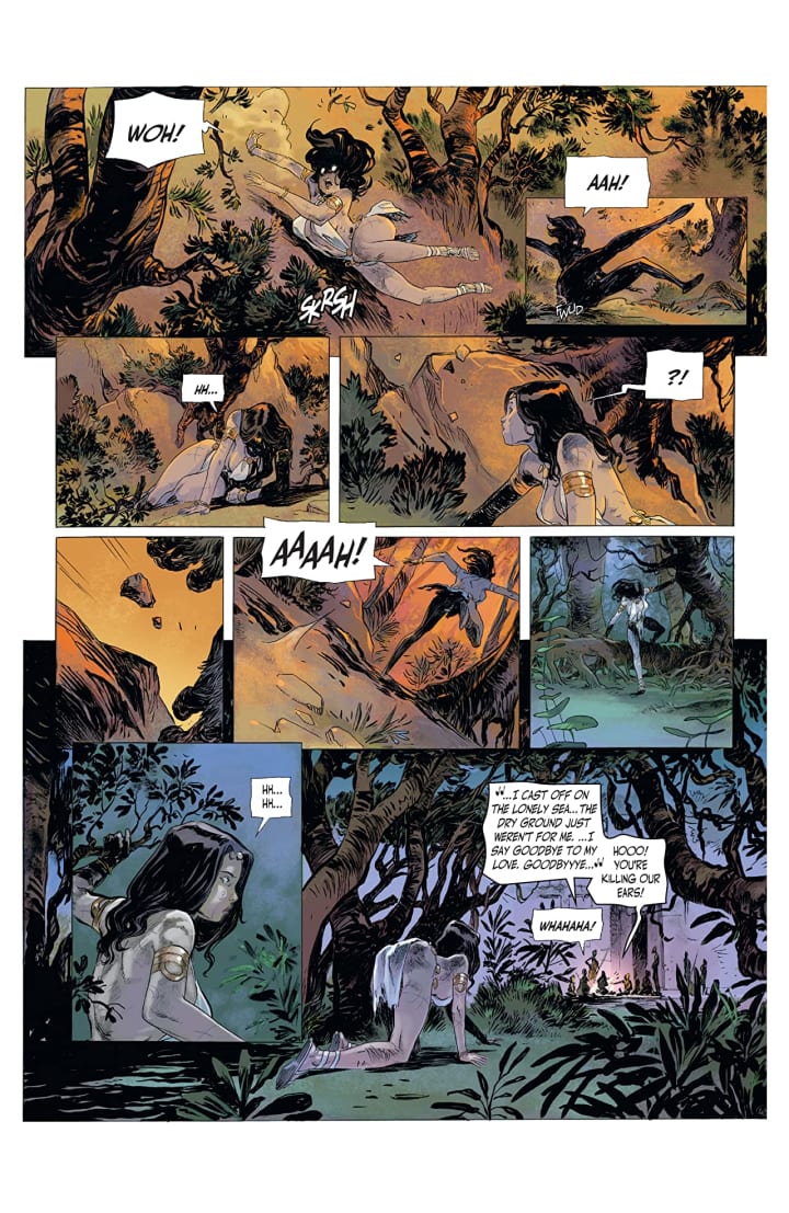 I have the utmost respect for anyone who can do the writing and the artwork and Virginie is to be admired for this because of how well it all looks and feels. The linework is beautiful and how we see the varying weights and techniques being utilised to create the detail work is extraordinarily well rendered. That backgrounds are as important to the story as we see them here not only enhance the moments but do wonders in bringing us depth perception, a sense of scale and that overall sense of size and scope to the story is magnificently laid down. The utilisation of the page layouts and how we see the angles and perspective in the panels show a marvellously talented eye for storytelling. The colour work is fabulous! How we see the various hues and tones within the colours being utilised to create the shading, highlights and shadow work is being done with aplomb. I love the techniques that we see in how the colour is laid down and how it leaves such a massive impact on the reader whether that consciously or subconsciously.
