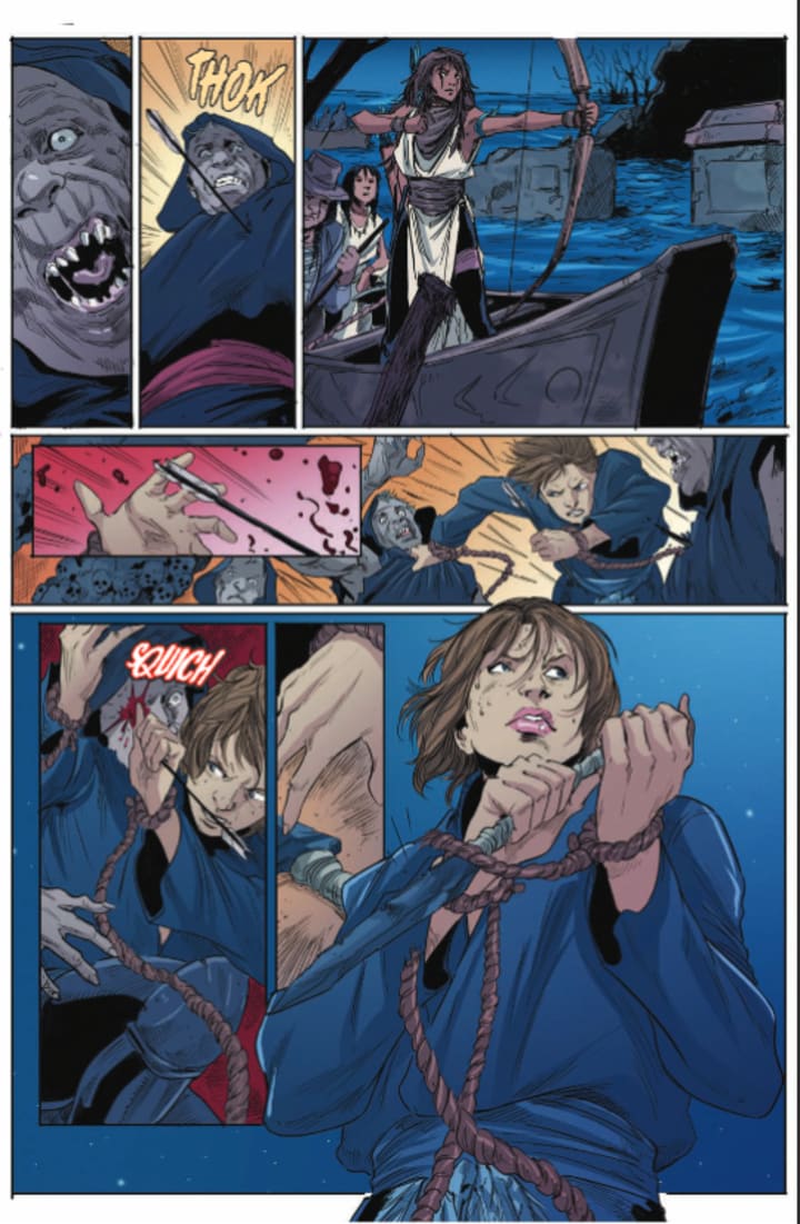 I am a huge fan of the interiors here. The linework is phenomenal and how we see the varying weights and techniques being utilised to create this level of detail in the work is extraordinary to see. The faces and facial expression plus how we see the body language does wonders in fleshing the characters out even further. I’d like to see more backgrounds being utilised, the talent and skill is here and it’s all that’s really missing. Otherwise the depth perception, sense of scale and the overall sense of size and scope we see is extremely well rendered. The utilisation of the page layouts and how we see the angles and perspective in the panels show a remarkably talented eye for storytelling. The colour work is brilliantly rendered. The various hues and tones within the colours being utilised to create the shading, highlights and shadow work shows a sensational eye for how colour works.