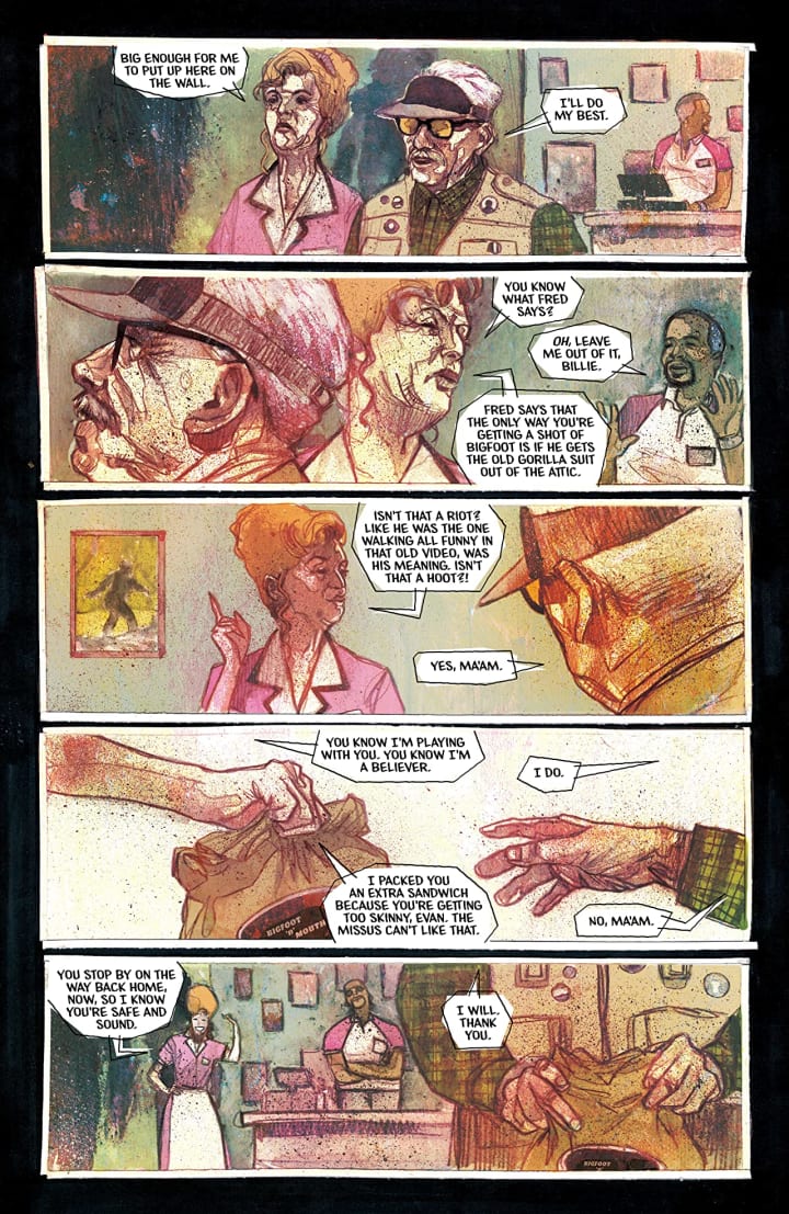 The interiors here are bloody marvellous. It almost feels like a grainy film that is shot by most conspiracy folks trying to prove the existence of something. It works beautifully with this type of story and the linework is gorgeous and how we see the varying weights and techniques being utilised to create this sensational detail work is mind numbing. The composition of the panels and how they bring us depth perception, a sense of scale and that overall sense of size and scope to the story is marvellous. The utilisation of the page layouts and how we see the angles and perspective in the panels show a brilliant eye for storytelling. The colour work is equally as brilliant to see. The various hues and tones within the colours being utilised to create the shading, highlights and shadow work is so incredibly well rendered.