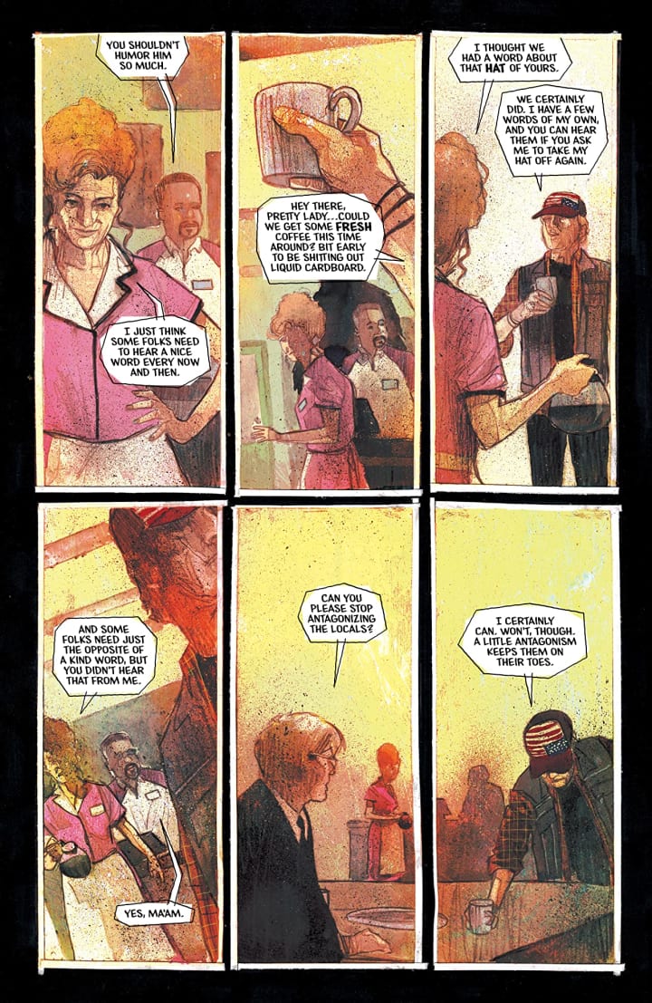 Oh my stars and garters this is a spectacular issue! I love Cole he’s been able to really roll with the punches as it were and this is no exception as Hawk has called him out to rural Oregon. What I love about this series is that it takes risks and it brings us ideas and thoughts that can shape reality if enough folks believe in what is said, take Trump supporters who believe in lies to the extent that they’ve created their own reality out of it. The power of belief shouldn’t go unnoticed and that James takes this and pushes it even further and breaks barriers and boundaries in so many different ways is absolutely delightful. Also that there is this network of folks who are in place to ensure that certain safeguards are upheld well it just boggles the imagination and really ignites something inside the readers mind.