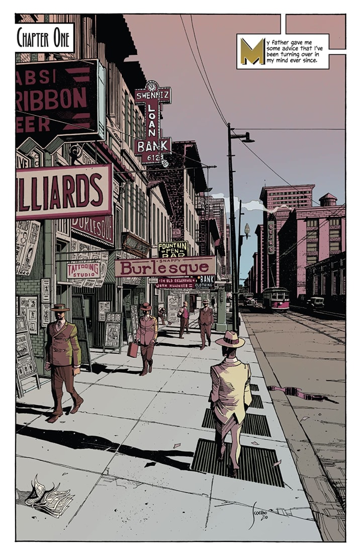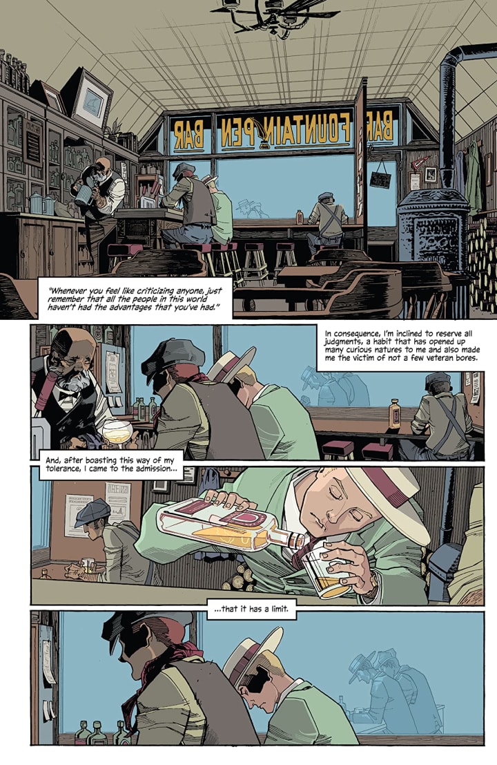 There is something absolutely amazing about how we see the interiors here. The linework we see through the varying weights and techniques being utilised to create the detail work in this style captures the whole 1920’s American feel. To see the city streets and the party or the ladies on the chaise lounge we get so much feeling and emotions coming at us and it’s brilliantly handled. How we see the depth perception, sense of scale and the overall sense of size and scope to the story is rendered very nicely. The utilisation of the page layouts and how we see the angles and perspective in the panels show a remarkable eye for storytelling. The colour work is gorgeous. How the various hues and tones within the colours are being utilised to create the shading, highlights and shadow work shows a great understanding of how colour actually can and does work.