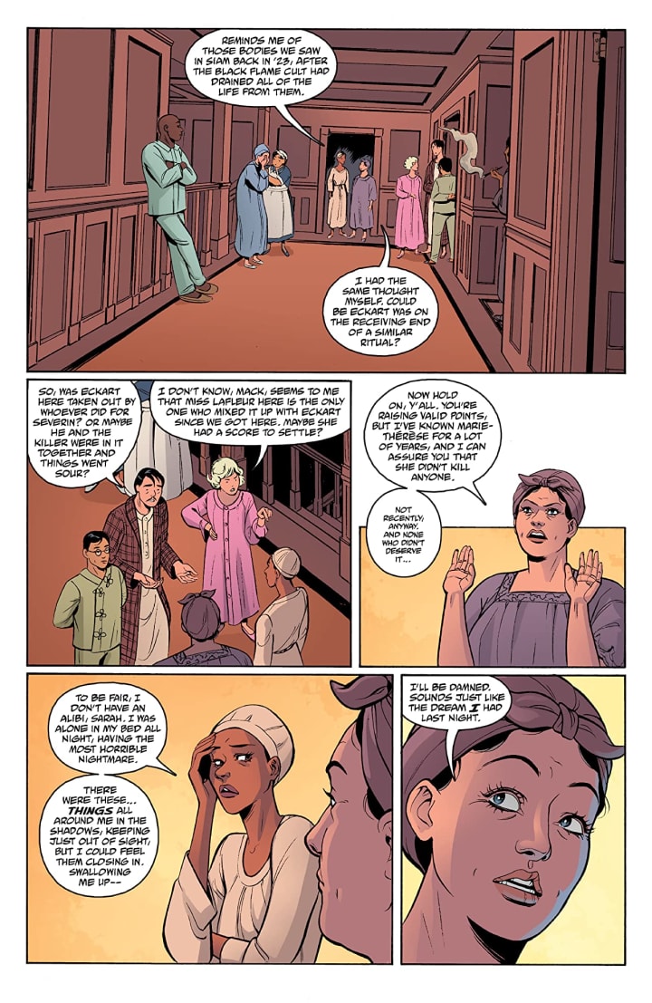 I love the interiors here and how they bring this era to life so completely and beautifully. The linework is marvellous and how we see the varying weights and techniques being utilised to create the detail work is utterly sensational. The fashion is definitely interesting and Sarah’s moomoo is a definite nono but Marie-Therese’s outfit is darling. How we see the backgrounds being utilised, which we could always see more, to showcase the house as well as provide depth perception, a sense of scale and that overall sense of size and scope to the story is incredibly well rendered. The utilisation of the page layouts and how we see the angles and perspective in the panels show a masterful eye for storytelling. The colour work is gorgeous! How we see the various hues and tones within the colours being utilised to create the shading, highlights and shadow work show a splendid eye for storytelling. The choices of colours and how the different techniques in laying down the colour is done show an excellent understanding of how colour works.