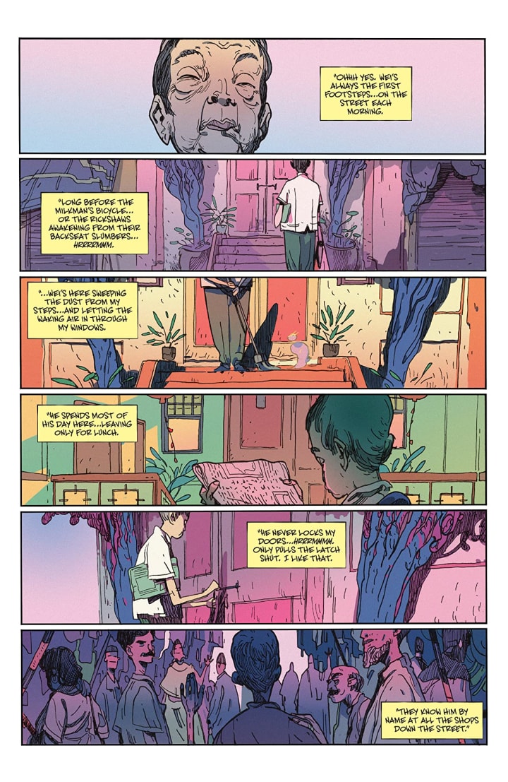 There is a very definite style to the interiors and while we’re four issues in they’ve managed to grow on me slightly. The linework is strong and how we see the varying weights being utilised to create the detail work is well done. When we see backgrounds being utilised they do wonders in expanding and enhancing the moments and how they work within the composition of the panels to bring us depth perception, a sense of scale and the overall sense of size and scope to the story is well achieved. The utilisation of the page layouts and how we see the angles and perspective in the panels show a talented eye for storytelling. The colour work is extremely nice to see. The choice of colours are bold and beautiful and how the various hues and tones within the colours being utilised to create the shading, highlights and shadow work is sensationally well rendered.