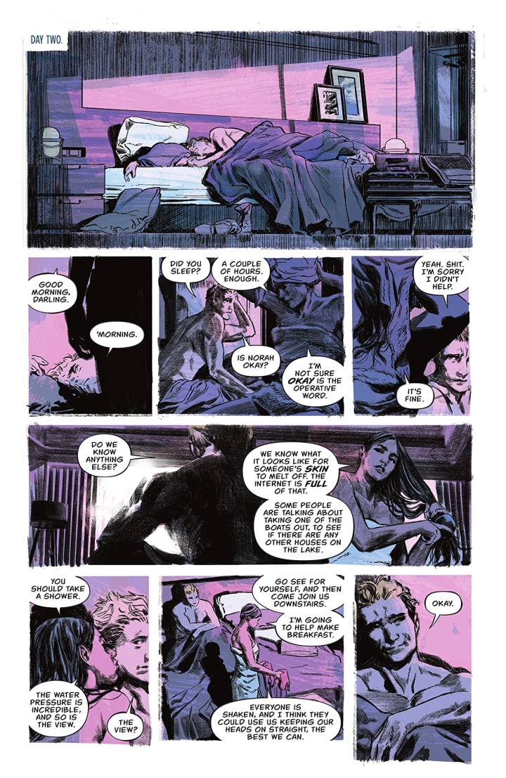 After the life-changing events of the previous issue, the guests at the nice house on the lake must decide their next steps-but there’s not exactly perfect agreement about the situation. Who among them is ready to walk out the door? And who is content to simply…float?