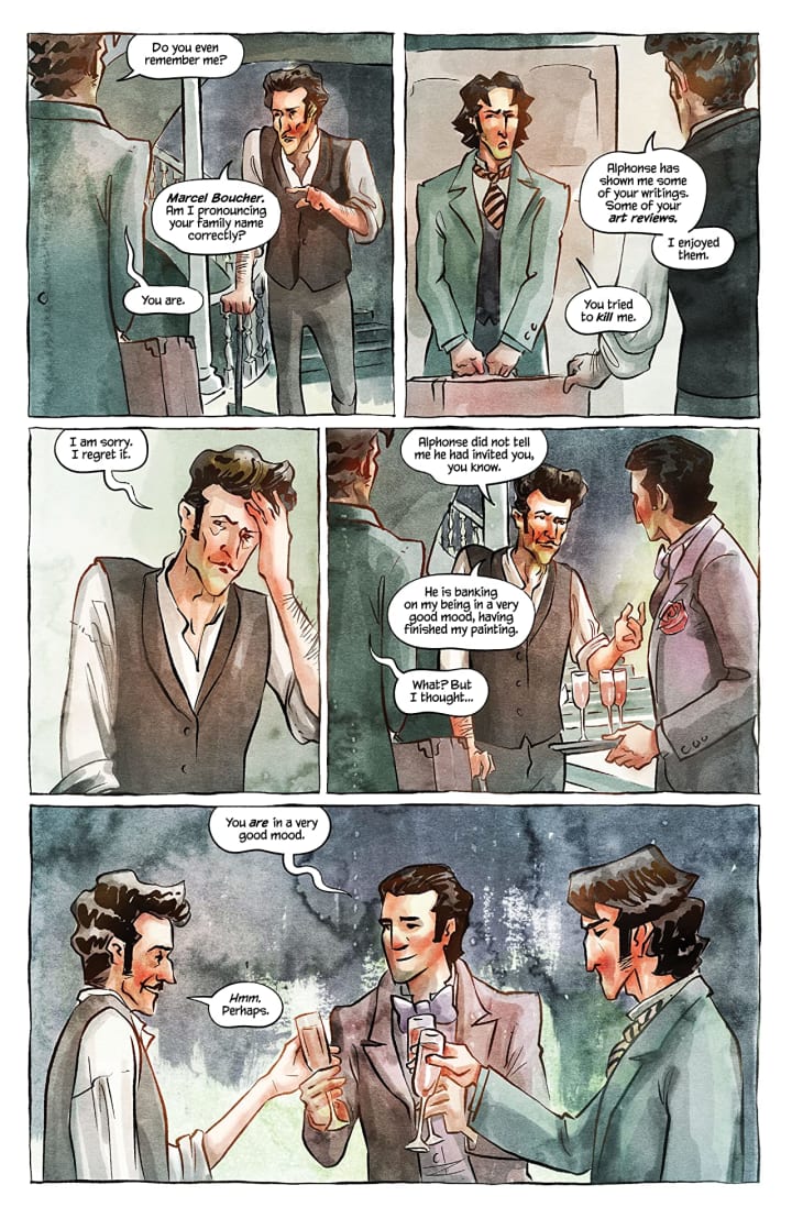 The interiors here are astoundingly good. The watercolour painting style in a book about painters is that kind of ironic that fits so perfectly. The linework we see and how it’s utilised to create the detail work is utterly gorgeous. The way backgrounds play such an integral role in the book and how they work within the composition of the panels to bring us depth perception, a sense of scale and that overall sense of size and scope to the book is masterfully done. The utilisation of the page layouts and how we see the angles and perspective in the panels show a remarkably talented eye for storytelling. The colour work is amazing. I love how watercolour is able to be different shades, hues or tones depending how the amount used and how water can thin it out. So to see the shading, highlights and shadow work as we do shows such control, talent and skill when it comes to painting.