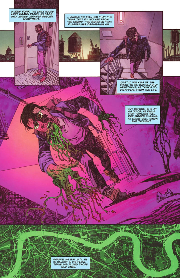 Newly armed with the knowledge and powers he gained from the Green and yet lonelier than ever, Levi Kamei is pulled once more into service as the Avatar of the Green is summoned by primal forces to the city of London, where old ideas lie buried, slowly leaching into the reality above. The scars of old wars and the dangers of past ideologies resurface as the Swamp Thing must team up with an old trench-coated acquaintance and his new protégé to save the present from the atrocities of our past.