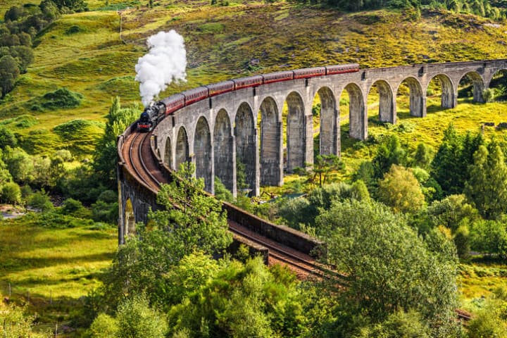 From King’s Cross we jump to the Glenfinnan Viaduct. Located at the top of Loch Shiel in the West Highlands of Scotland, the viaduct overlooks the Glenfinnan Monument and the waters of Loch Shiel. The viaduct runs for 380 meters (1140 feet) in length and stands at 100ft tall in its centre.