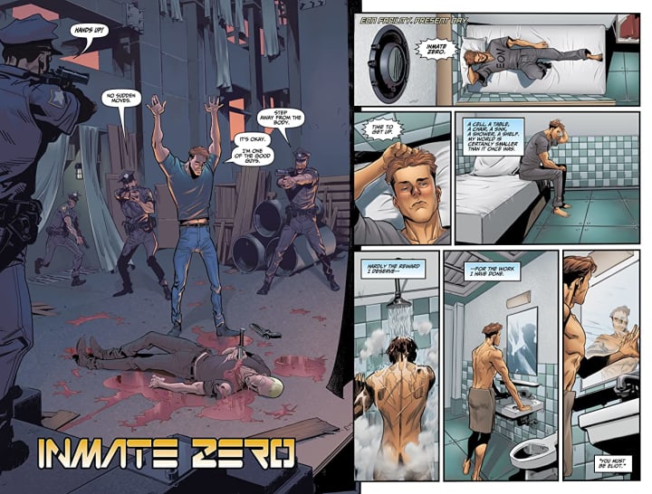 The interiors here are very stylised and rather quite nice to see. The linework is fantastic and how we see the varying weights and techniques being utilised to create the detail work is stupendous. I will say this I wish that shower scene was so steam strategic, i mean it is just his buttocks and i’d have loved to see how nice that arse really is. We see backgrounds utilised extremely well throughout the book as they enhance the moments as well as seeing how they work within the composition of the panels bringing us the depth perception, sense of scale and the overall sense of size and scope to the story. The utilisation of the page layouts and how we see the angles and perspective in the panels show a marvellous eye for storytelling. The colour work is extraordinary to see. The various hues and tones within the colours being utilised to create the shading, highlights and shadow work is beautifully rendered. I have to say that seeing the blood and and the refection in it is absolutely gorgeous and that lightning really pops and it shows someone with a stellar eye for how colour works.