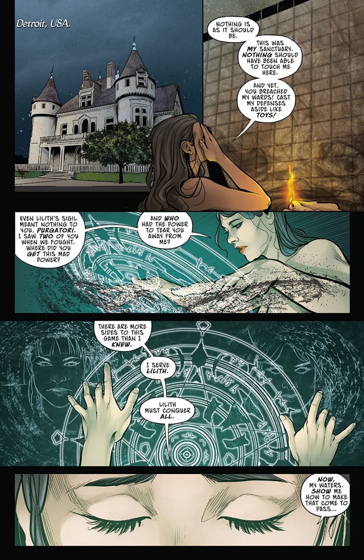 I love how this is being told. The story & plot development that we see through how the sequence of events unfold as well as how the reader learns information is presented exceedingly well. After the events of last issue to be opening up with Lilith’s seer taking us through current events is a fabulous way to get us going. The character development that we see is pretty amazing thanks the dialogue, the character interactions and how they act and react to the situations and circumstances that they encounter. All of this helps to continually flesh these folks out and it does so beautifully. The pacing is superb and as it takes us through the pages revealing more of the story along with its twists & turns keeps the reader on the edge of their seat with anticipation.