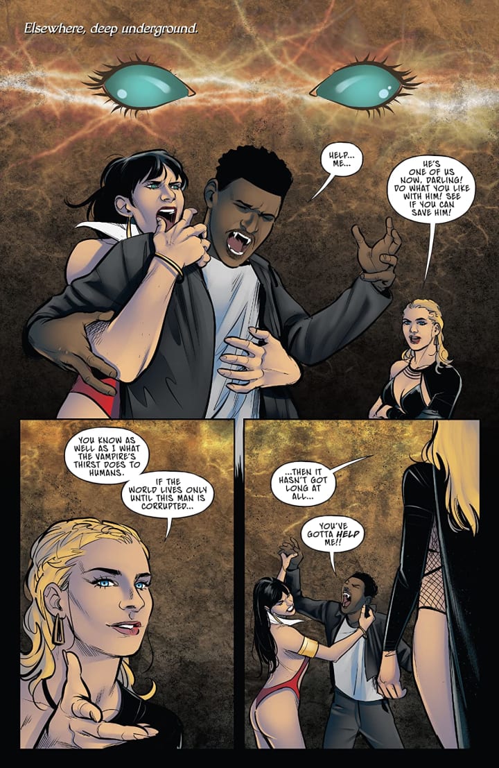 All the players are out in the open now, and the field’s starting to get bloody. Sacrifices are being made and heads are rolling… and now, of course, VAMPIRELLA’s finally got to face it: PURGATORI’s not on her side. She’s not on the enemy’s side, either. She’s on her own side, and the stakes are even bigger than before. Bigger than the whole world? Yeah. That’s right. And now this whole damn fight's going to have to get UGLY.
