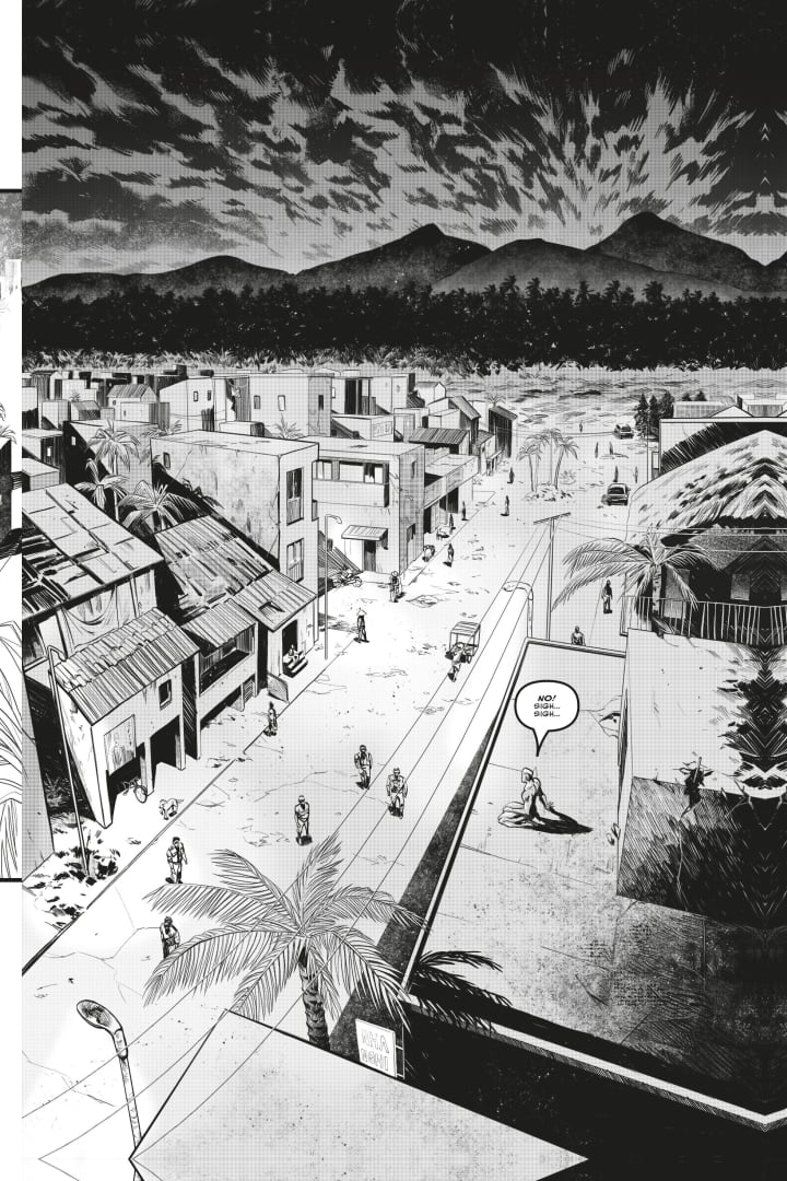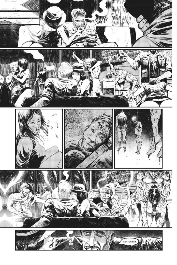 The interiors here are abso-freakin-lutely amazing to see. The linework is exquisitely laid down and how the varying weights and techniques are being utilised to create this level and quality of work going into the details is mind numbingly gorgeous. The way that backgrounds are utilised throughout to enhance the moments and work within the composition of the panels to bring out this depth perception, sense of scale and the overall sense of size and scope to the story is bloody brilliant. The creativity and imagination that we see is off the charts and i’m a little upset that we don’t really see the soldiers junk as he’s screaming naked on the buildings roof. Also Stevenson in those tighty whities seems off as well considering where his wound is but hey i’m all about seeing naked men. The utilisation of the page layouts and how we see the angles and perspective in the panels show such a masterful eye for storytelling. The black & white plus gray tones that we see throughout are so beautifully mastered and laid down here and it’s such a pure joy to see.
