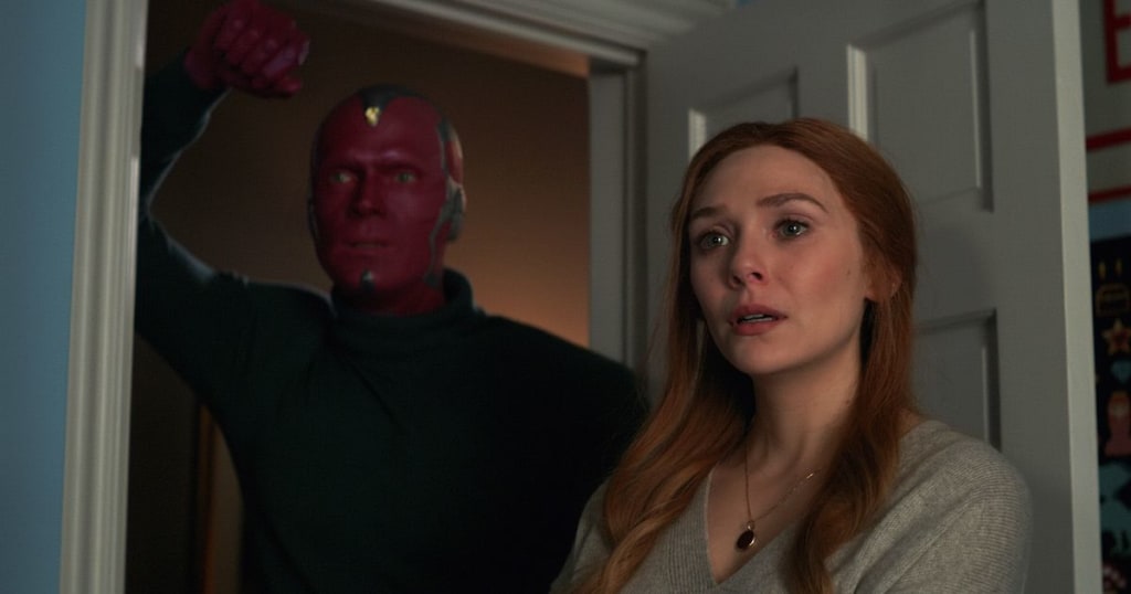 Speed or Tommy thinks his uncle Pietro is super cool which tracks because they have the same powers. Obviously the highlight of this episode is everyone's comic book accurate halloween costumes. Vision has developed his own consciousness enough to defy what Wanda wants and this causes tension between the two. I know everyone really wanted this show to lay the groundwork for the X-men and were rather disappointed when that turned out to not be the case, however I’d argue that it actually did that. Those who know what the majority of the X-Men's conflicts are know that mutants are seen as an abomination their stories are often allegories for racism and I think Haywards reactions to super powered individuals, his disdain and hatred for them does in fact lay the groundwork for the X-Men and how they would be received in the current state of the MCU. The fans that cried Mephisto got one more little nugget and ran with it in this episode when the boys are out trick or treating and uncle Pietro yells after them “Raise hell demon spawn” nice try but it was nothing more than a throwaway line or a simple call to the comics. Pietro and Wanda’s conversation made it clear that Wanda is not the one that brought in her brother, we also see the boys use their powers for the first time. Vision encounters the townspeople at the edge of the hex bubble and they are barely moving, he is observing until he encounters Agnes who asks him for help. Woo and Monica form a plan to make their way back into the hex. Pietro is provoking Wanda, seeing right through the magic, mind control and illusions he asks her how she did it, trying to find out what the source of her power is. She then sees the dead version of Pietro just as she did with Vision before. We see Vision try to leave the hex just as the SWORD agents arrive at the border, as he was created by Wanda within the boundaries of Westview, he starts to rip apart. It looks like he is being sucked back into the hex piece by piece. Wiccan can feel his fathers pain, and hear what is going on outside of the hex so the boys run to their mom for help. Quicksilver lets it slip that Vision is already dead, causing Wanda to blast him into some hay, then we get to see Wanda’s real power as she stands in the middle of town square and expands the boundary of Westview, it grows fast and wide as Wanda tries to engulf Vis back into her magic bubble. In doing so the hex pulls in Darcy and quite a few SWORD agents.