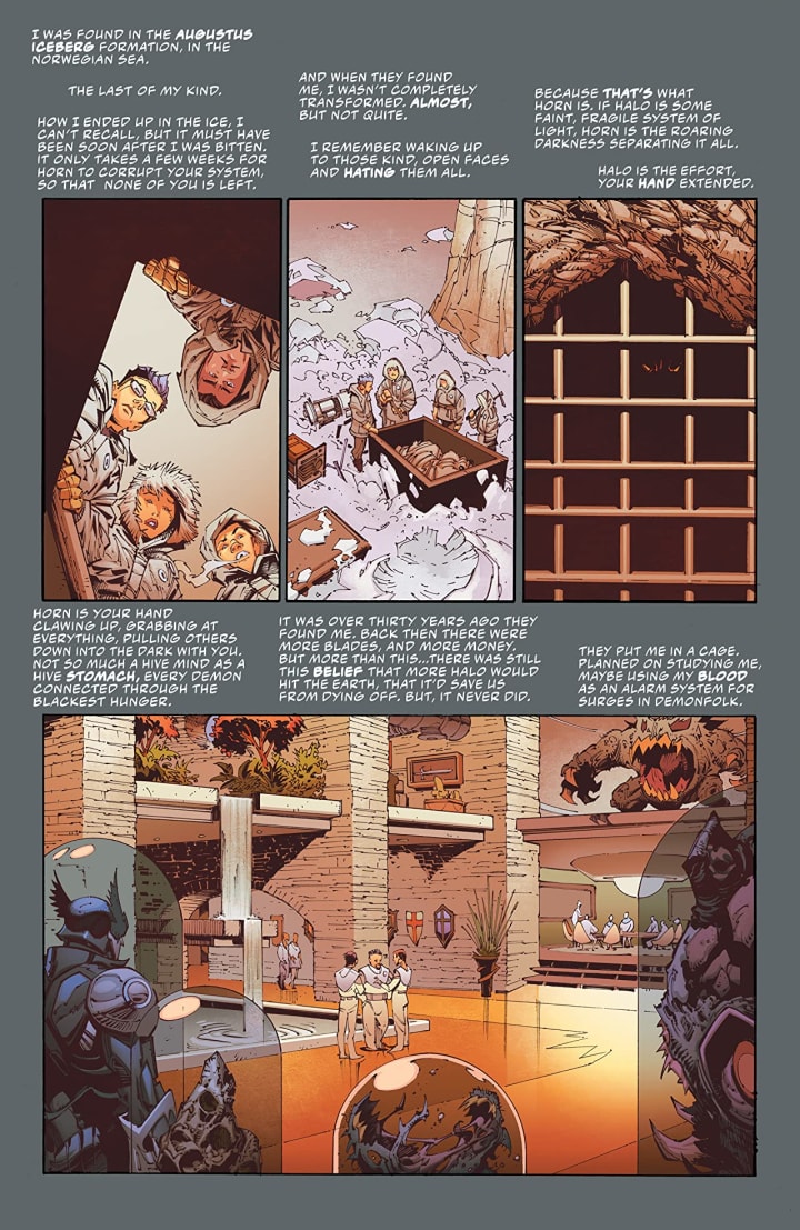 I’m digging the interiors here. I love that we see the pencils and inks being so in sync that it feels like it’s one person doing all the work. The linework is phenomenal and how we see the varying weights and techniques being utilised to create the detail within the work is extraordinary to see. How we see backgrounds being utilised and how they enhance and expand the moments are marvellously handled. How they work within the composition of the panels brings out the depth perception, sense of scale and the overall sense of size and scope to the story. The utilisation of the page layouts and how we see the angles and perspective in the panels shows a remarkable eye for storytelling. The various hues and tones within the colours being utilised to create the shading, highlights and shadow work shows a stellar understanding of how colour works and how to maximise their effects. From light sources to how that light changes colours on clothes and such to the glow of the Halo weapons we see such great work.