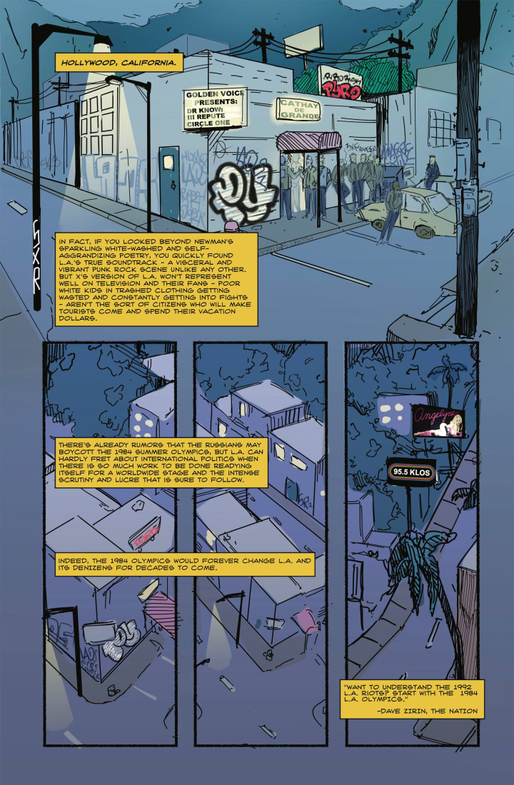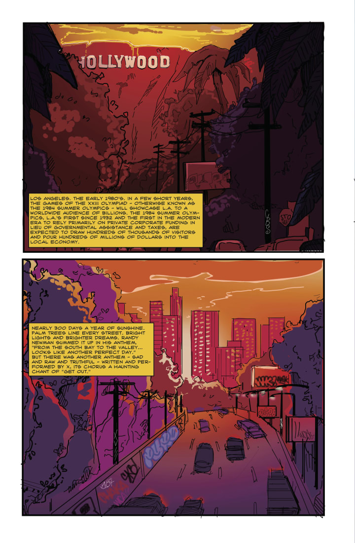 Volume 1 begins with the shocking and senseless assault of a privileged suburban teen, as Lost Angeles follows local punk bouncer ‘Doyle’ as he investigates the crime on behalf of a grieving family and ultimately exposes a complex multi-billion-dollar real estate investment scheme tied to the 1984 Olympics whose greedy tentacles reach deep into City Hall. A vivid and unquestionably authentic portrayal of LA’s vibrant and violent 1980s, Lost Angeles brings to life the punk music, gangs and corrupt officials and, in doing so, echoes themes of race and politics very much alive and unresolved in 2021.