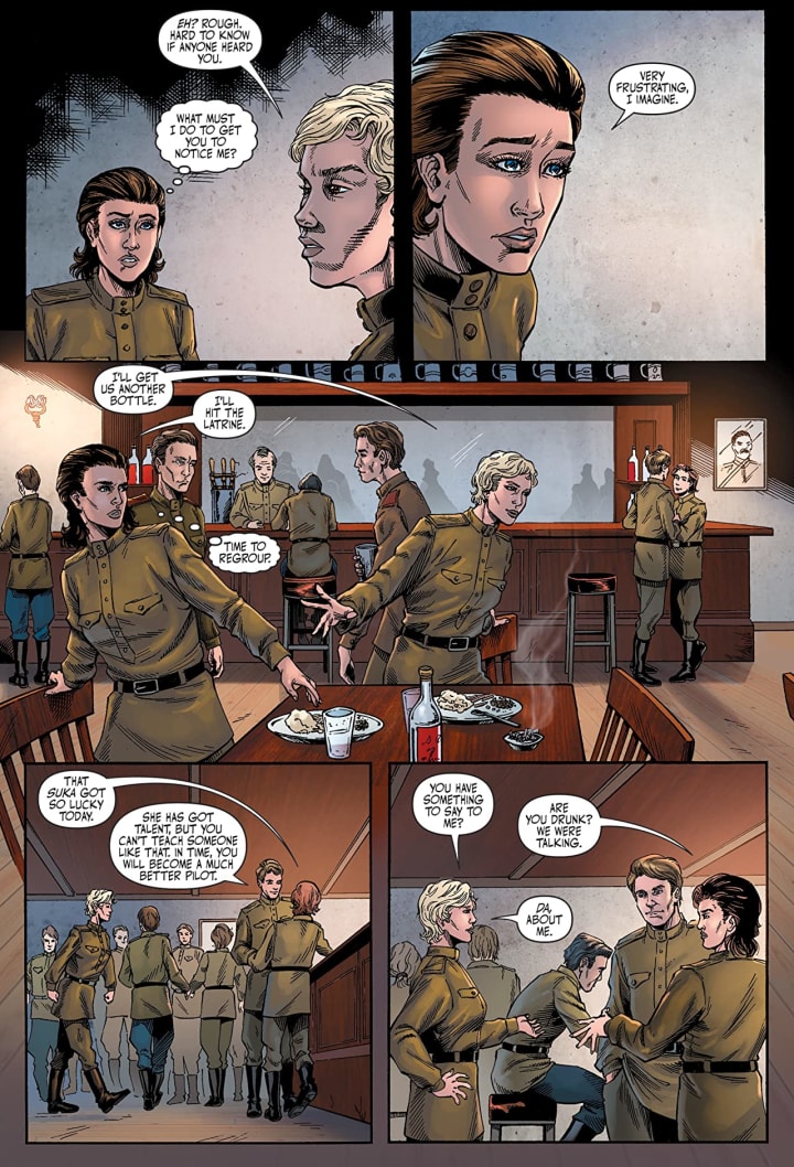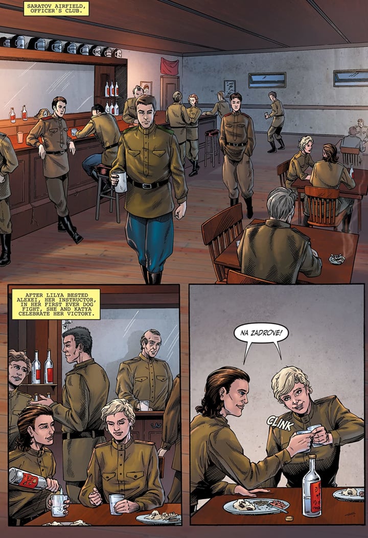 In this issue, the pair are thrown into combat missions as the Battle of Stralingrad drags on. Witness the retelling of the first ever historical occasion where a woman shot down an enemy plane. Watch as a love triangle unfolds between Katya's budding sapphic emotions for Lilya and Lilya's whirlwind romance with Alexei. Marvel at the massive air battles over Stralingrad.