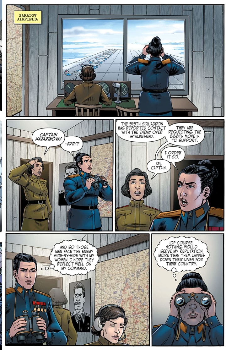 Katya and Lilya engage the enemy in a massive dogfight over the city of Stalingrad. Lilya is shot down and has to parachute into the enemy city.