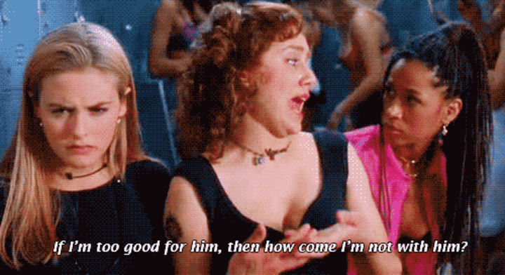 Cher, the most popular girl in school, is wanted by every single boy, no matter their social status. But that doesn't mean that she reciprocates these feelings. When she's walking at school and a boy comes around and puts his arm around her against her will, cue the famous "ugh, as if!" line. Ladies, remember- your body is yours alone, and you get to give consent always.