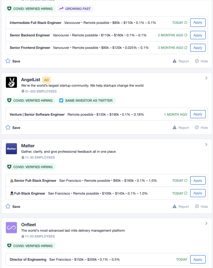 Let me walk you through a real-life example and explain the numbers for you. Here is a screenshot of a job search on AngelList -