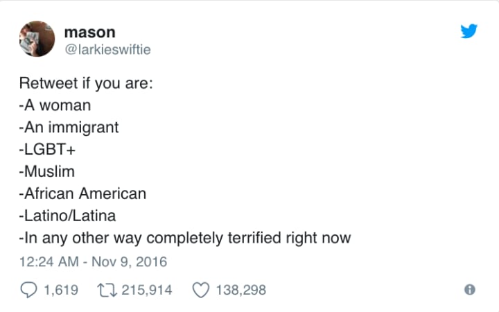 Right now, a lot of liberals are looking at the world in shock. They believed the battles for tolerance and equality were over, but to them the election of Donald Trump is a symbolic rejection of everything they believe in. One tweet that's going viral is this: