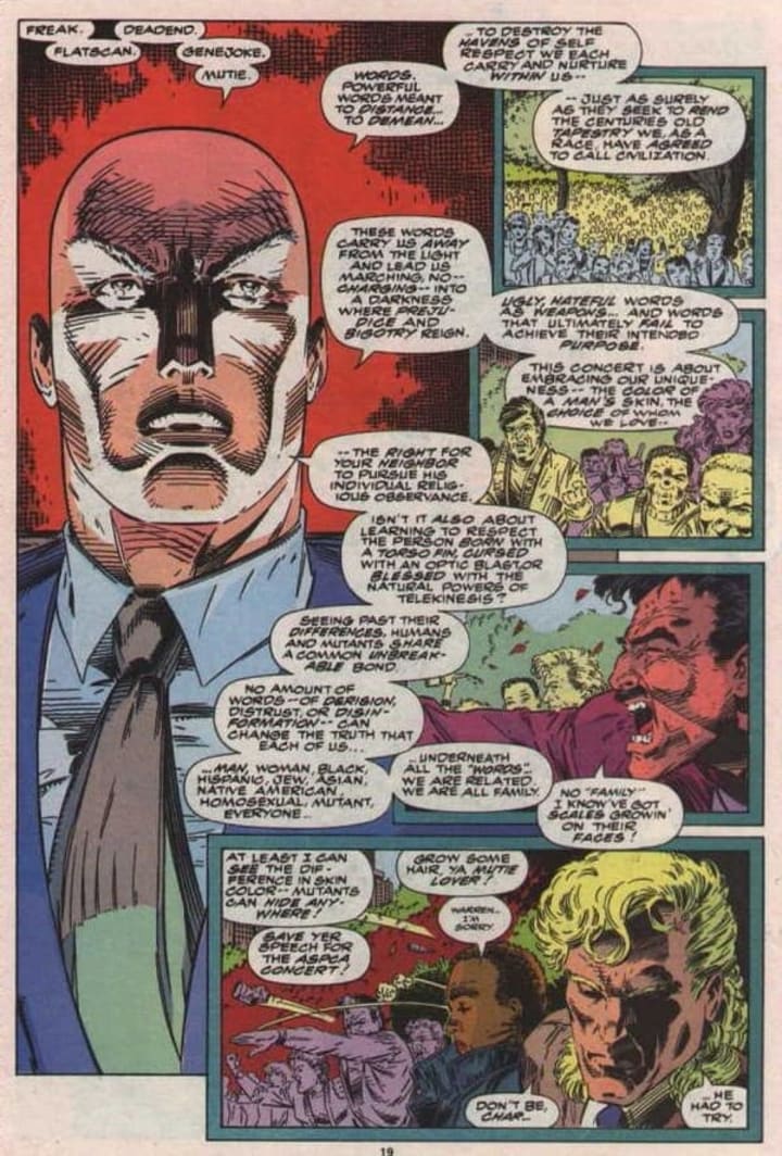 Into the 1990s, the comics extended this metaphor, deliberately tying the X-Men into wider themes of prejudice, tolerance and equality. The "X-Cutioner's Song" arc kicked off with a speech from Charles Xavier in which he tied the battles for racial and sexual equality to his attempt to bring about peace between man and mutant. Into the 2000s, X2 was heavily inspired by "God Loves, Man Kills", and was fairly faithful to the comics' original themes. In one famous scene, Iceman's parents asked him if he'd ever tried... not being a mutant. It was a deliberate parallel with the experience of many members of the LGBT community.