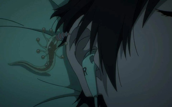 An alien enters Shinichi’s window one night and attempts to kill him and take over his body, burrowing itself into his right arm and heading right up the artery to his brain. A very panicked Shinichi is able to stop it by wrapping his earbuds cord around his arm and stopping its path, saving his own life. The parasyte fails to take over his brain in the process, but it is able to eat and gain control over Shinichi’s right arm, making both Shinichi and the alien somewhat of an anomaly to other parasytes and humans.