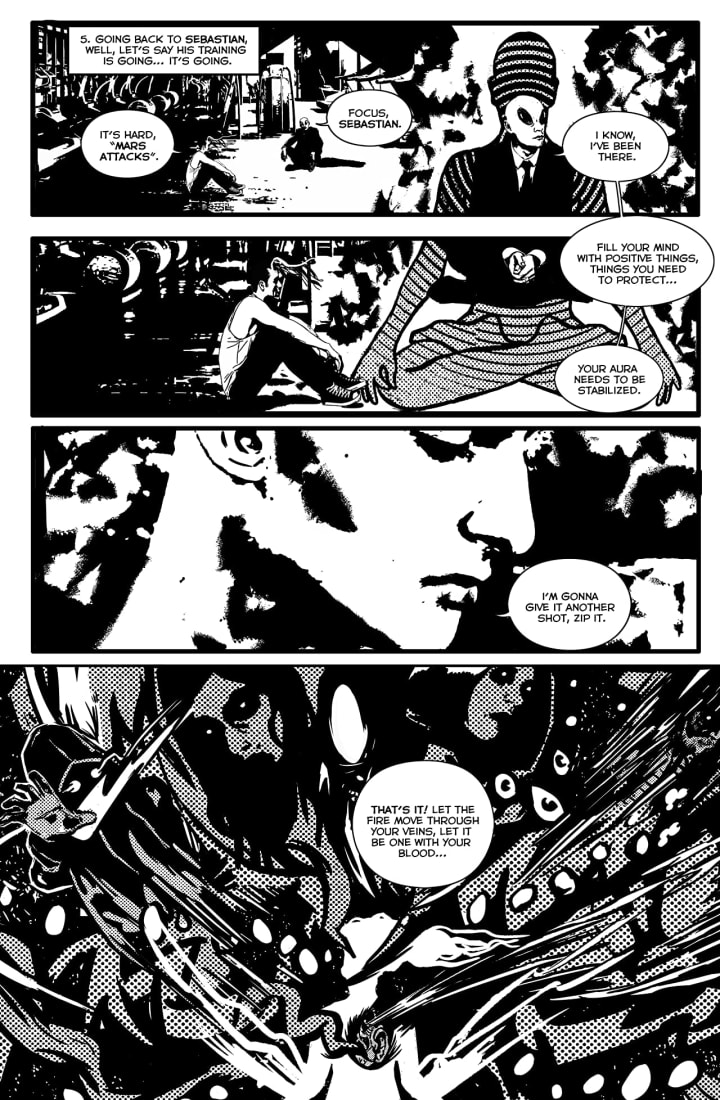 This whole story is one mind trip after another and it’s like I’m having some kind of giant acid flashback. Yet we know the world is supposed to end, we know the comet gave folks powers, we know that Sebastian’s father thinks he’s the Antichrist, who happens to be chased by the anti-everything. These factors and more are what make this so damn interesting, complicated and dangerous for everyone involved. The writing and character are spectacular and the interiors are utterly brilliant and that nothing conforms to what would be considered close to normal just keeps the appeal that much stronger. I’m obsessed with this book and the more I see the more I want to see, I can’t stay on the morphine cause it’s making me itch and it’s an itch that’s impossible to scratch, not that I really want to scratch it anyway cause I’m afraid it’ll go away.