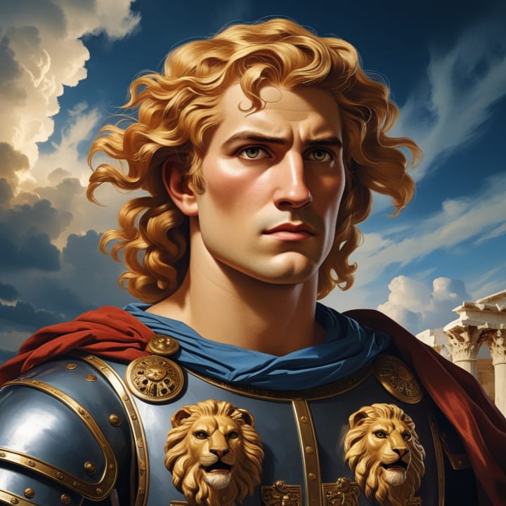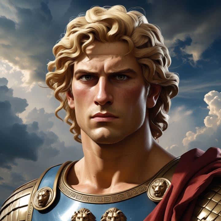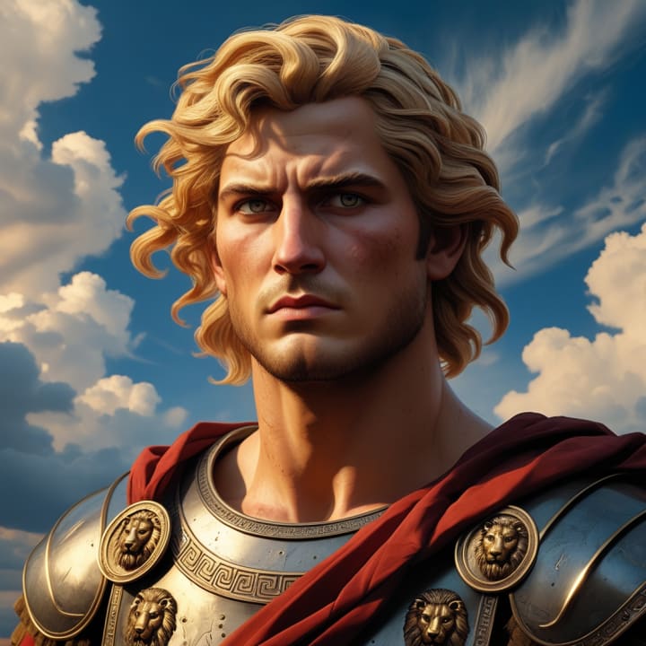 This portrait captures Alexander the Great as a young and determined warrior. With wavy golden-blond hair, piercing eyes, and a strong, well-defined facial structure, he exudes power and confidence. His Greek-style breastplate with lion motifs symbolizes his strength and divine lineage. The dramatic sky in the background reflects his legendary conquests and enduring legacy.