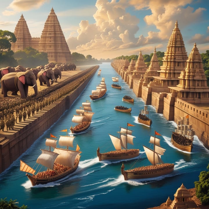 This image symbolically represents the military and naval strengths of two of India’s greatest empires. On one side, the Mauryan Empire is depicted with its mighty infantry, war elephants, and fortifications, showcasing its dominance in land warfare. On the other side, the Chola dynasty's naval fleet sails triumphantly, symbolizing their supremacy in the Indian Ocean. The contrasting elements capture the unique strategies and legacies of these iconic civilizations.