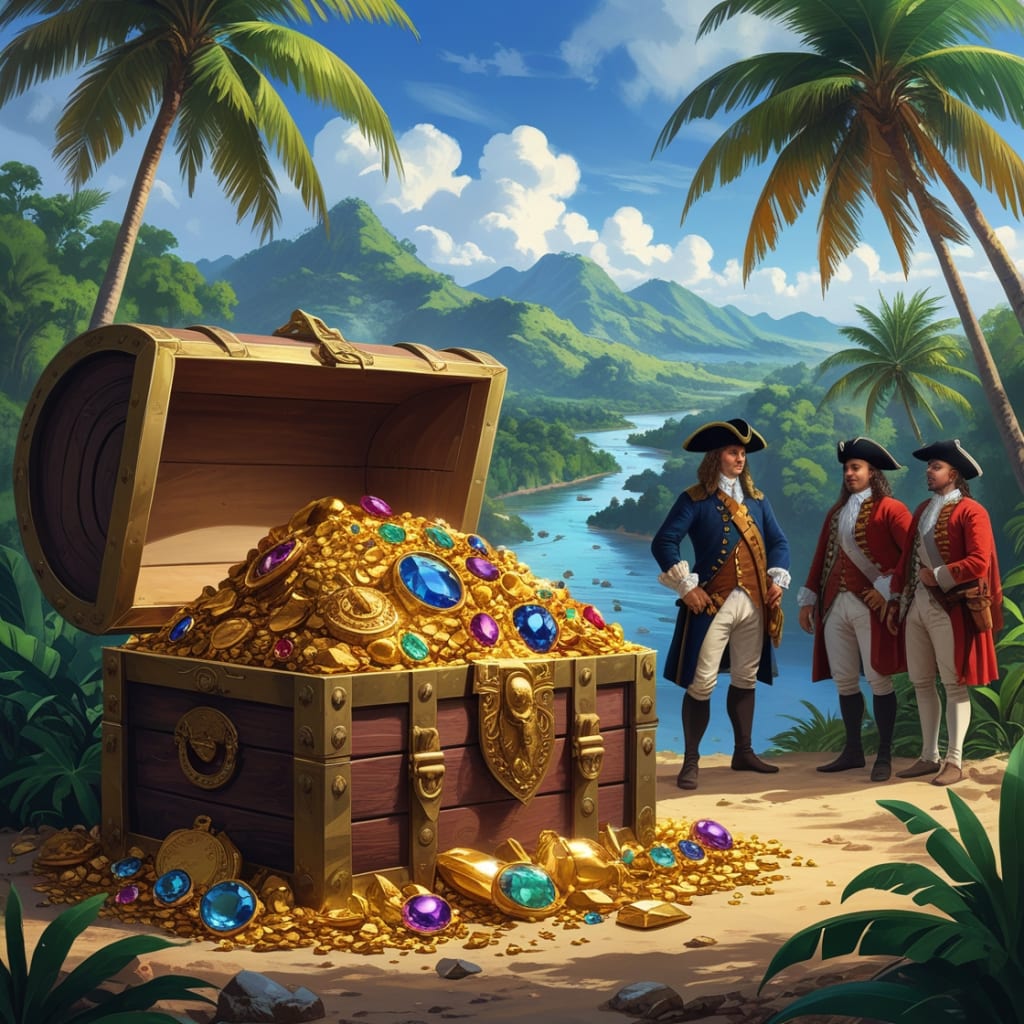 This artwork captures a symbolic portrayal of the colonial era, highlighting the large-scale extraction of gold, gems, and other natural resources. The treasure chest, tropical backdrop, and figures involved evoke the historical reality of colonial exploitation while maintaining a reflective and balanced representation.