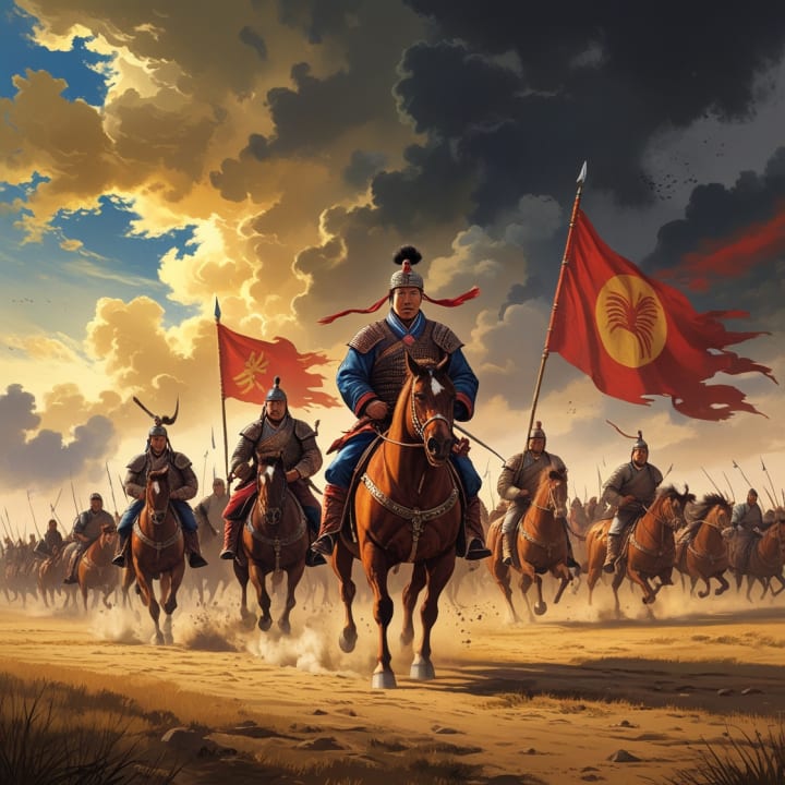 This powerful illustration captures Genghis Khan leading his Mongol army into battle, charging across the open steppes. The image showcases the ferocity of the Mongol warriors, their banners flying high as they overwhelm their enemies. The dramatic backdrop of a stormy sky and rugged terrain highlights the epic nature of his conquests.