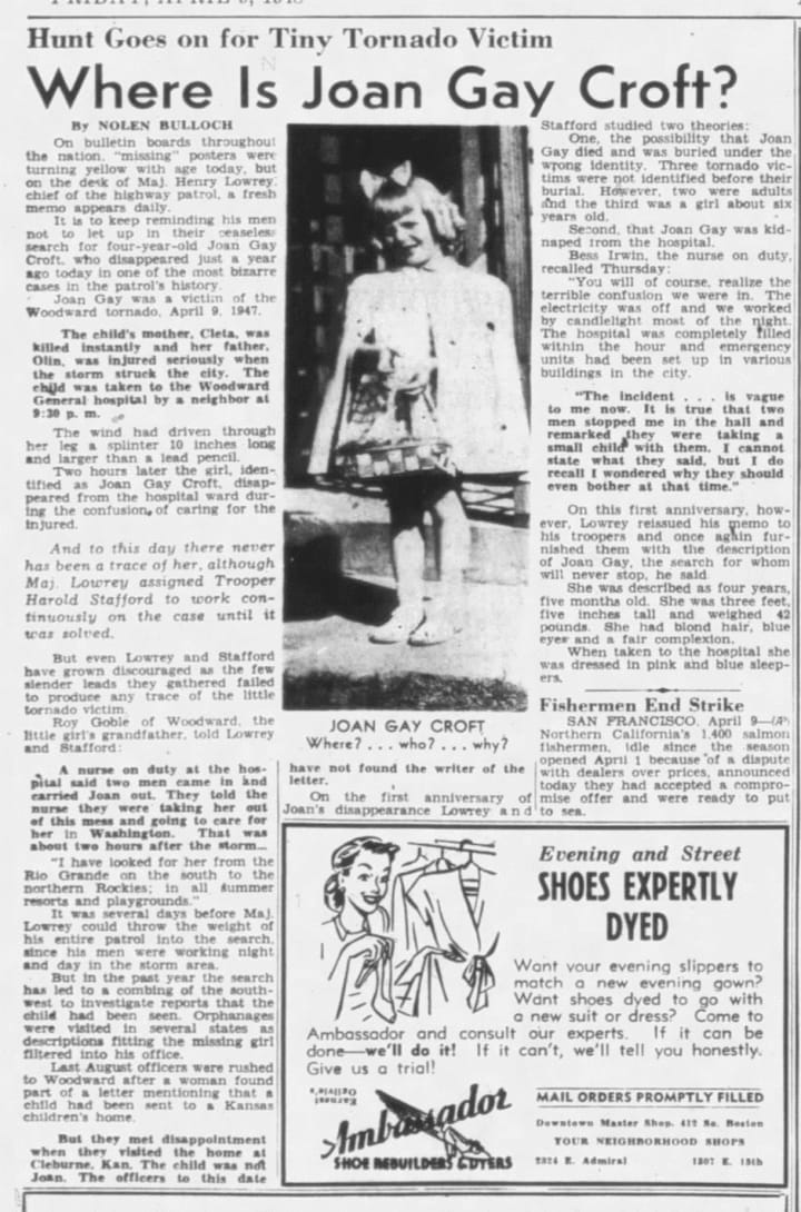 A nurse had briefly questioned the men, asking where they were taking the child. They replied that they were transporting Joan to a hospital in Oklahoma City—120 miles away—where her father was supposedly waiting. With children being moved across the state to reunite families in the aftermath of the disaster, the explanation raised no immediate alarm, and the men were allowed to leave.