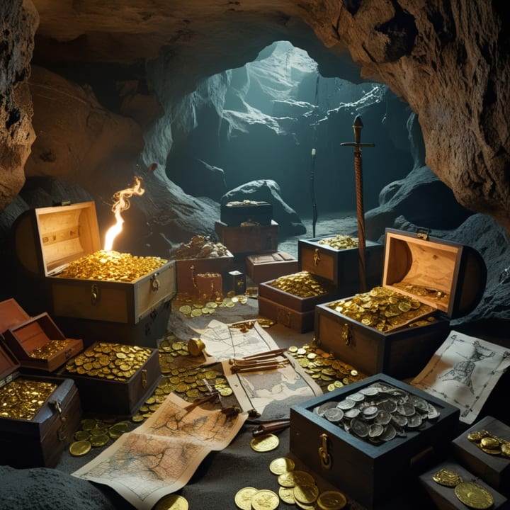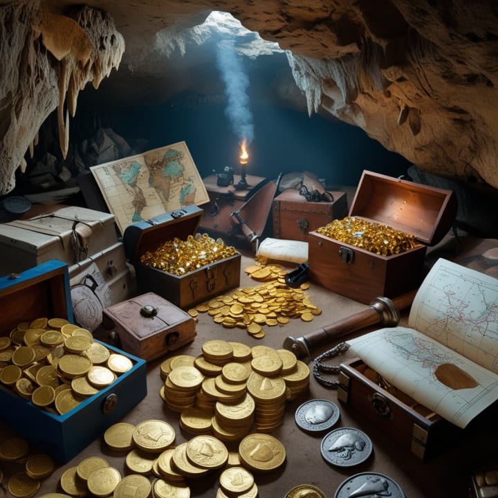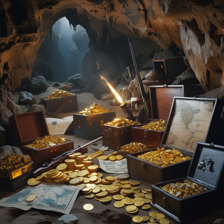 This image captures the mystery and allure of America’s lost treasures, depicting a hidden cave filled with gold coins, ancient artifacts, and overflowing chests of jewels. Illuminated by torchlight, the scene reveals pirate maps, old weapons, and lost riches from different eras, symbolizing the legendary wealth that still awaits discovery.