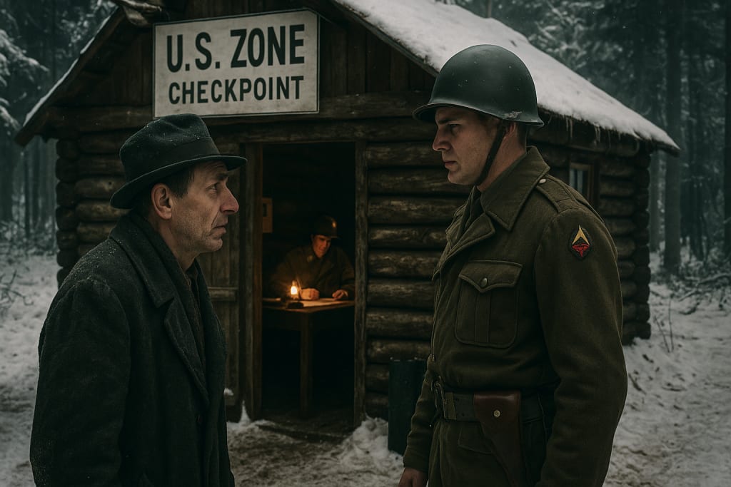 After hours of trudging through frozen woods near the Bohemian border, Franz stopped before a dimly lit cabin. Above the door, nailed crookedly, was a wooden sign: U.S. Zone — Checkpoint. An American flag, slightly faded, swayed gently in the wind. Jan’s breath caught in his throat.